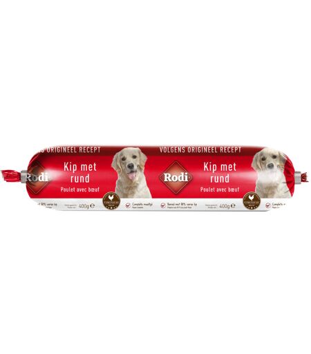 La saucisse Rodi poulet bœuf est produite de manière artisanale selon une recette originale. Cet aliment savoureux contient 81 % de viande fraîche de poulet et 4 % de bœuf et fournira à votre chien des protéines de qualité. Cette saucisse contient... ...