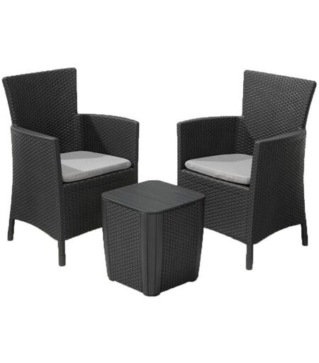 Description générale Profitez de votre extérieur avec cet ensemble de balcon en résine synthétique, idéal pour les petits espaces. Son design moderne en couleur anthracite et ses coussins moelleux vous garantissent un confort optimal. Composé de deux fauteuils et d'une table basse pouvant servir de coffre de rangement, cet ensemble allie esthétique et fonctionnalité. Sa structure résistante aux intempéries (froid, pluie, neige, air salin) et aux rayons UV facilite son entretien, nécessitant juste un chiffon humide pour le nettoyage. Spécifications techniques Dimensions de la table (L x P x H) : 39 x 39 x 42 cm Poids de la table : 3,1 kg Dimensions d’un fauteuil (L x P x H) : 63 x 60 x 89 cm Poids d’un fauteuil : 5,2 kg Matériaux : Résine de synthèse (polypropylène) Imitation rotin tressé Épaisseur de la résine : 7 mm Coloris : Gris anthracite Matière des coussins : Polycoton Couleur des coussins : Gris clair Traité anti-UV 100 % recyclable Compatibilité et accessoires Comprend : 2 ...
