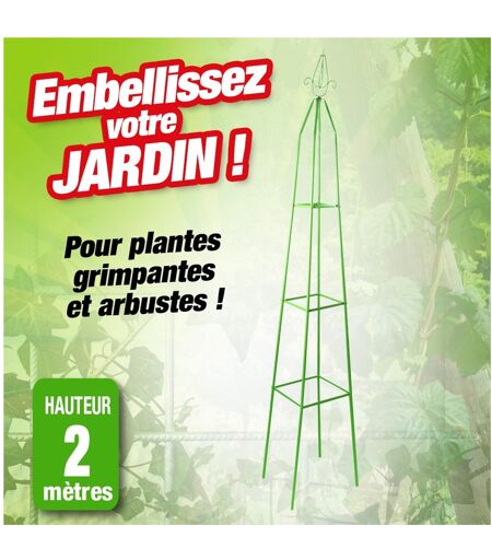 Support décoratif pour plante en métal. Hauteur 2m Aménagez votre jardin avec ce tuteur en forme d'obélisque de jardin pour pour plantes grimpantes en métal laqué vert. Dimensions 31x31x200cm (largeur au sol). Peut-être utilisé pour les fleurs, les arbustes fruitiers, les rosiers, le lierre. Il est d'une hauteur d'environ 200 cm. C'est une décoration en métal laqué stable à utiliser comme tuteur pour plantes grimpantes. Coloris vert. Poids : 1,5kg. La construction métallique pointue est solide, résistante aux intempéries et facile à monter. Les éléments de décoration ne sont pas fournis. Il résiste à l'humidité et aux intempéries. Matériel: métal laqué - D: 12 mm. ...