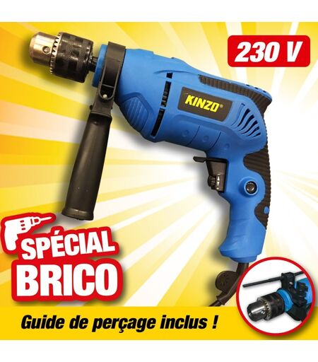 Perceuse électrique à percussion, 230 volts, bonne tenue en main, alimentée par cable. Poignée amovible. Perceuse électrique à percussion, 230 volts, 500watts, bonne tenue en main, alimentée par cable. Pas de souci de batterie à recharger pendant vos travaux. Votre perceuse vous permettra de percer le bois, le fer, le plâtre et puisqu'elle est à percussion les matériaux + durs comme le béton. Livré avec son mandrin, son guide de perçage pour éviter de percer trop profond et sa poignée amovible. Perceuse de marque Kinzo, une bonne qualité à un prix spécial ! Très bonne prise en main. Excellent rapport qualité prix. ...