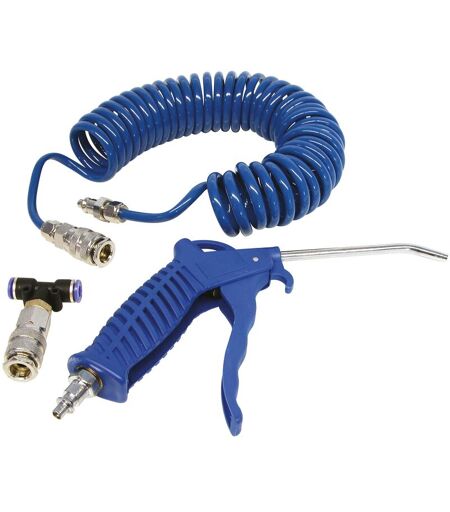 Souflette professionnelle tuyau spirale 5m Pistolet à air avec embout de 120mm en acier. Tuyau spirale en PU de 5 mètres. Raccord rapide en T avec soupape de fermeture automatique à bille bronze. Pistolet et tuyau équipés de connecteurs pivotants rapides. Pression maximale 10 kg/cm2. ...