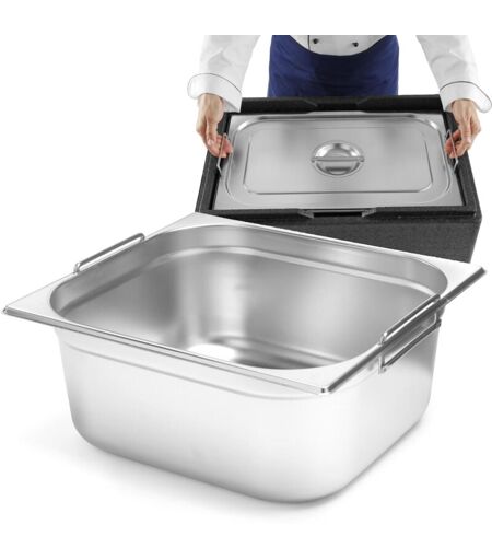 Référence fabricant : Hendi 817254 Le bac gastronorme GN à poignées rétractables de la gamme Budget de Hendi est un récipient idéal pour les traiteurs, les hôtels, les restaurants et les points de restauration mobile. Il se caractérise par une construction en acier inoxydable très solide et des bords arrondis pour un nettoyage facile. Caractéristiques et paramètres techniques de : - série Budget Line, - fabriqué en acier inoxydable, - équipé de poignées rétractables pour un transport facile, - bords arrondis pour un nettoyage facile, - peut être utilisé dans les fours à convection, les réfrigérateurs, les bains-marie et les réchauds, - résistance thermique de -40 à 300 degrés C, - épaisseur des parois de 0,6 à 0,7 mm, - capacité : 17 l, - format GN 2/3 normalisé, - dimensions (L x l x H) : 354 x 325 x 200 mm. Contenu de la livraison : - récipient GN ...