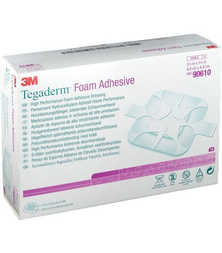 Taille du pansement: 8,8 cm x 8,8 cm Indication: Pansement primaire favorisant la cicatrisation en milieu humide des plaies aiguës superficielles et profondes telles que : les dermabrasions, les brûlures superficielles, les sites donneurs de greffe, les plaies avec perte de substance et les plaies chroniques modérément ou fortement exsudatives comme : les escarres, les ulcères veineux, les ulcères artériels, les ulcères diabétiques. Pansement secondaire pour plaie cavitaire. Description du produit: Les pansements 3M™ Tegaderm™ Foam Adhesive s'adaptent au niveau d'exsudats de la plaie. Ils permettent une évaporation rapide des exsudats grâce à la couche intelligente et aux fibres superabsorbantes. Ils préviennent la macération des plaies et les maintiennent en milieu humide tout en respectant le bourgeon charnu. Les pansements 3M™ Tegaderm™ Foam Adhesive ne laissent pas de résidus dans la plaie. Ils sont indiqués à la fois sur les plaies peu et/ou fortement exsudatives telles que les ulcères de jambes, les escarres, le pied du diabétique ou encore les brûlures superficielles. Le pansement hydrocellulaire adhésif haute performance Tegaderm™ Foam Adhesive est stérile et très absorbant. Souple, le pansement hydrocellulaire adhésif haute performance Tegaderm™ Foam Adhesive est bien supporté par le patient et s’adapte facilement aux reliefs anatomiques. Conseils d'utilisation: Lire attentivement le mode d'emploi. Composition: Mousse en polyuréthane comformable Conditionnement Pansements x10 ...