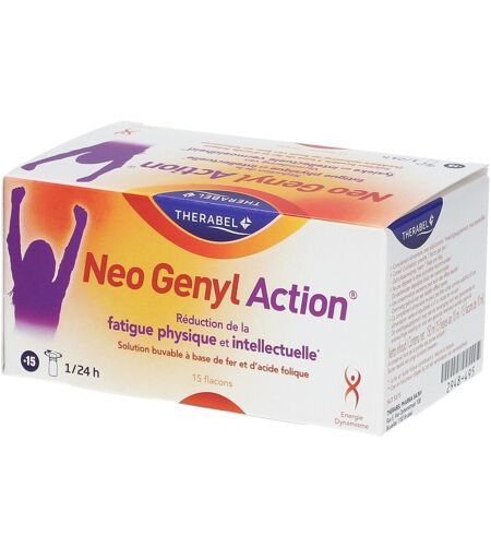 Complément alimentaire à utiliser dans le cadre d’une alimentation variée, équilibrée et d’un mode de vie sain.Neo Genyl ActionNeoGenyl Action® est un complément alimentaire vitamino-minéral buvable contenant du gluconate de fer, de l'acide folique et du L-arginine-L-aspartate.NeoGenyl Action® peut être utilisé en cas de fatigue physique et intellectuelle, problèmes de concentration, effort intellectuel intense, perte de vitalité, grossesse et allaitement. Le fer contribue à réduire la fatigue et participe à des fonctions cognitives normales.IngrédientsEau. L-arginine-L-aspartate. Epaississant: glycérol (E422). Gluconate de fer. Acidifiant: lactate de sodium (E325). Conservateurs: sorbate de potassium (E202) et benzoate de sodium (E211). Colorant: caramel au sulfite d'ammonium (E150d). Edulcorants: sucralose (E955), arôme ananas. Acide folique.Données nutritionnellesVitamines / minérauxPour un flacon% AR*Fer16,8 mg120 %Vitamine B9 (acide folique)400 µg200 %L-arginine-L-aspartate2,045 g/* AR = Apport de référence.Conseils d'utilisation1 flacon par jour.Précautions d'emploiConserver dans un endroit frais et sec.Tenir hors de portée des jeunes enfants.Ne pas dépasser la dose recommandée.Ne pas utiliser en même temps que des produits à base de chlorhexidine.Toute fatigue ou perte de vitalité anormale ou prolongée justifiera de consulter son médecin.Une consommation excessive peut avoir des effets laxatifs.Poids net15x10 mlFabricantTHERABEL Pharma SA292 Boulevard de l’Humanité1190 FORESTBelgique ...