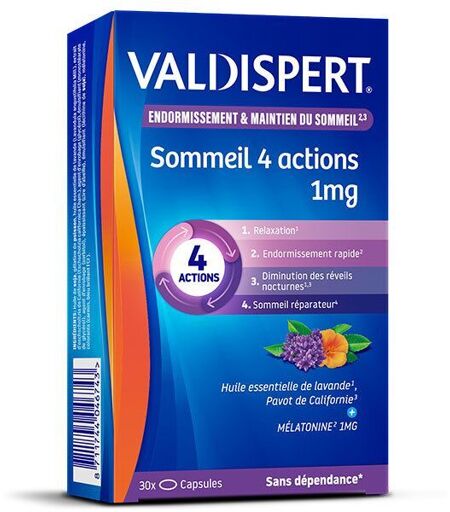 Complément alimentaire à utiliser dans le cadre d’une alimentation variée, équilibrée et d’un mode de vie sain.VALDISPERT MELATONINE 4 ACTIONS 1MGComplexe alliant mélatonine, huile essentielle de lavande et Pavot de Californie. Formule spécialement conçue pour réduire le temps d’endormissement (grâce à la mélatonine), favoriser une relaxation optimale (grâce à l’huile essentielle de lavande) et contribuer à un sommeil sain et de qualité (grâce au Pavot de Californie), caractérisé par une diminution des réveils nocturnes. Formule complète de haute qualité contrôlée, sans dépendance ni accoutumance connues aux doses recommandées. Innovation galénique sous forme de capsule liquide offrant un concentré d’actif en une capsule par jour.LA MELATONINEA partir de 1 mg, la mélatonine contribue à réduire le temps d’endormissement. La mélatonine régule notre rythme éveil-sommeil et joue un rôle important dans le processus d'endormissement. La production de mélatonine peut être altérée avec l’âge ou à cause de décalages horaires (jet lag, horaires décalés, période d’examen…) ou de changements de rythme de vie. Valdispert mélatonine complète naturellement la présence de mélatonine dans l’organisme.L’HUILE ESSENTIELLE DE LAVANDEL’huile essentielle de lavande favorise une relaxation optimale et aide à maintenir un sommeil sain.LE PAVOT DE CALIFORNIELe Pavot de Californie favorise un sommeil naturel et de qualité. Un sommeil est de qualité lorsqu’il permet de se sentir en pleine forme le matin, grâce notamment à la diminution des réveils nocturnes.A UTILISER EN CAS DEDifficultés à s’endormirBesoin de relaxationRecherche d’un sommeil de qualité: sommeil réparateur, sommeil naturel, moins de réveils nocturnesComposition:Huile de Soja, Gélatine de Poisson, Huile Essentielle de Lavande (Lavandula angustifolia Mill;), Extrait d'Eschscholtzia de Californie (Eschscholzia californica Cham.), Agent d'Enrobage (Glycérol), Émulsifiant (Monostéarate de Glycérol), Agent d'Enrobage (Sorbitol), Épaississant (Cire d'Abeille), Émulsifiant (Lécithine de Soja), Colorants (carmin, bleu brillant FCF), Mélatonine.Valeur nutritionnelle: Pour 1 capsuleMélatoine1 mgHuile essentielle de Lavande50 mgExtrait d'Eschscholtzia (Pavot de Californie)50 mgConseil d'utilisation:1 capsule à avaler 30 minutes avant d'aller se coucher.Précautions d'emploi:Ne pas dépasser la dose journalière recommandée. Tenir hors de portée des enfants. À conserver à l’abri de la chaleur et de l’humidité.Poids net:13 g = 30 capsulesFabricant:Vemedia Consumer Health France114, rue Galleni92100 Boulogne Billancourt ...