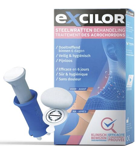 Excilor Traitement des acrochordons Élimination effective dans les 6 jours Facile à utiliser à la maison Sûr et hygiénique Indolore Efficacité cliniquement prouvéeCaractéristiques Excilor Traitement des acrochordons avec SafeFix Technology a une action unique et brevetée. Lorsqu’on utilise Excilor Traitement des acrochordons, le flux sanguin irriguant l’acrochordon est arrêté par une ligature. L’acrochordon va alors sécher lentement, en toute sécurité et sans douleur, avec un risque minime de cicatrice. L’acrochordon sèche et se détache dans le pansement. Retirez le pansement contenant l’acrochordon après 6 jours. Efficacité et sécurité testées et cliniquement prouvées sur 177 acrochordons. La recherche montre que le traitement est indolore et présente un excellent résultat cosmétique.Conseils d'utilisation Vérifiez si l’excroissance cutanée est bien un acrochordon (voir « Faites le test »). En cas de doute, consultez votre médecin. Nettoyez la zone autour de l’acrochordon avec un gant de toilette et de l’eau chaude. Vous pouvez utiliser un savon doux. Séchez soigneusement la zone.Appliquez le pansement avec l’applicateur en suivant les explications fournies dans la notice d’utilisation.Précautions d'emploi Ne pas utiliser l’appareil pour éliminer des acrochordons sur les paupières, si l’acrochordon n’est pas couleur chair ou est un peu plus sombre, saigne ou ne correspond pas au diamètre de l’applicateur. Consultez votre médecin si vous avez des antécédents de cancer de la peau, si vous êtes hémophile ou si l’acrochordon présente des signes de maladie cutanée ou d’infection. Si vous n’êtes pas certain que l’excroissance cutanée concernée est un acrochordon, consultez votre médecin avant de commencer le traitement. N’utilisez pas le dispositif si vous êtes allergique à un ou plusieurs des ingrédients. Réservé à un usage externe. N’utilisez pas le dispositif s’il est endommagé. Ne pas utiliser avant 18 ans.CompositionSupport : polyester et caoutchouc synthétique Disque : polyoxyméthylène (POM)Enveloppe : polyester et acrylateConditionnement 1 applicateur3 dispositifs (disques avec pansements) ...