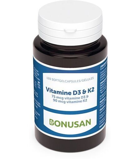 Complément alimentaire à utiliser dans le cadre d'une alimentation variée, équilibrée et d'un mode de vie sain.Bonusan Vitamine D3 & K2 contient une combinaison de deux vitamines qui se renforcent mutuellement. Séparément, elles ont déjà de nombreux effets positifs sur la santé. Des recherches scientifiques récentes montrent que les vitamines D et K contribuent ensemble au maintien d'une ossature normale. Ce produit ne contient que les formes les plus assimilables des vitamines, à savoir la vitamine D3 et la vitamine K2 (sous forme de MK7 de K2VITAL®).Dans une huile d'olive naturelle pour une meilleure absorptionFortement dosé avec 75 mcg de vitamine D3 et 90 mcg de vitamine K2Soutient le système immunitaire grâce à la vitamine DIngrédientsHuile d'olive vierge (Olea europaea), paroi de la capsule (gélatine bovine, glycérine, eau, colorant (caramel)), ménaquinone-7, cholécalciférol.Données nutritionnellesComposition par gélule Vitamine D3 (sous forme de cholécalciférol) (3000 UI)75 mcg1500 % AR*Vitamine K2 (sous forme de ménaquinone-7, K2VITAL®)90 mcg120 % AR*Huile d'olive vierge (Olea europaea)250 mg *AR = Apport de référenceConseils d'utilisationsPrendre une gélule par jour directement après le repas. Ne pas dépasser la dose recommandéePrécautions d'emploiConserver au frais et au secNe pas dépasser la dose recommandéeConserver en dehors de portée des enfantsEn cas d'utilisation de dérivés coumariniques (anticoagulants), consulter un expert avant d'utiliser ce produit.Poids net120 gélulesFabricantBonusan c.s.Postbus 7212NL-3280 AA NumansdorpPays-Bas ...