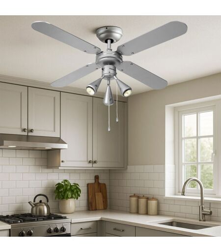 Description Ventilateur de plafond avec spots réglables pour le salon. Ce ventilateur de plafond d'un diamètre de 102 cm présente plusieurs fonctions. Outre l'effet rafraîchissant, le ventilateur assure une circulation d'air agréable et chauffante en hiver grâce à l'avance et au recul réglables. Le ventilateur dispose en outre de trois douilles GU10 équipées d'une ampoule LED. Le corps en métal argenté forme un contraste décoratif avec les trois spots mobiles. Les pales réversibles sont disponibles en gris argenté ou en bleu marine. La vitesse est réglable sur trois niveaux. Ce ventilateur de plafond pratique se commande confortablement à l'aide d'un interrupteur à tirette. Les ampoules sont comprises dans la livraison. Détails • Type de produit : Ventilateur de plafond • Matériau : métal, argent, bois • Pales : gris argenté ou bleu marine (réversibles) • spots mobiles - circulation d'air silencieuse (max. 43,5 dB(A)) • interrupteur à tirette pour la lumière • interrupteur à tirette ...