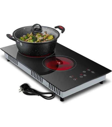 【Plaque vitrocéramique 2 feux 3000W】Le plan de cuisson vitrocéramique a 2 brûleurs puissants réglables séparément, zone de cuisson supérieure puissance maximale 1800W et zone de cuisson inférieure puissance maximale 1200W. Le chauffage est plus rapide et plus efficace. Dotée d'une surface en verre noir résistante, elle est facile à nettoyer, il suffit de l'essuyer avec un chiffon humide. 【9 réglages de puissance】Chaque zone de cuisson dispose de 9 niveaux de puissance réglables. Grâce à sa commande tactile sensible, il répond à tous vos besoins pour toutes les cuissons : bouillir, mijoter, rôtir, remuer et griller. Plaque de cuisson electrique chauffe les aliments de manière plus homogène et empêche les casseroles, poêles et aliments de brûler. 【Fonction minuterie】La plaque electrique 2 feux dispose d'une fonction minuterie de 99 minutes qui facilite la cuisson et vous laisse les mains libres lorsque vous êtes très occupé. La zone de cuisson peut être éteinte automatiquement après un ...