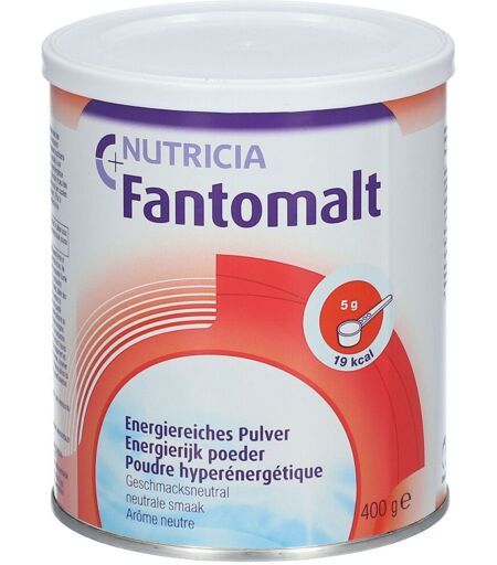 Il est important d'avoir une alimentation variée et équilibrée et un mode de vie sain.Fantomalt est un complément nutritionnel hyperénergétique à base de dextrine-maltose. Ne contient ni protéines, ni lipides. Fantomalt se dissout facilement dans les boissons chaudes ou froides. A un goût neutre et peut être ajouté aussi bien aux boissons sucrées ou salées. A utiliser sous surveillance médicale.Sans gluten et pauvre en lactose. Fantomalt est une source d'énergie complémentaire en poudre qui peut être mélangée à vos repas, pour combler les manques éventuels. Cela contribue ainsi à l'amélioration de votre statut nutritionnel.Fantomalt est une denrée alimentaire destinée à des fins médicales spéciales pour les besoins nutritionnels accrus en énergie.Composition: Dextrine-maltose.Valeur nutritionnelle: Par 100 gÉnergie1630/384 kJ/kcal Glucides dont glucose dont maltose dont polysaccharides96 g1,5 g4,5 g90 gSucre0 gGraisse0 gProtéine0 gFibres0 gSel0,005 gConseils d'utilisation:Une mesurette rase contient 5 g de poudre. Peut être ajouté à des boissons chaudes ou froides et à des plats préparés. Préparer une portion et consommer dans les 2 heures qui suivent la préparation. Une fois ouvert, doit être utilisé dans un délai de 1 mois.Précautions d'emploi:A utiliser sous contrôle médical. Usage entéral exclusif. Ne convient pas comme seule source de nutrition. Ne convient pas au patient atteints de galactosémie.Ne pas dépasser la quantité journalière recommandée. Conserver dans un endroit frais (6-25 °C) à l'abri de la lumière. Tenir hors de portée des enfants.Poids net: 400 gFabricant:Nutricia Nutrition Clinique150, boulevard Victor Hugo93400 Saint-Ouen CEDEX ...