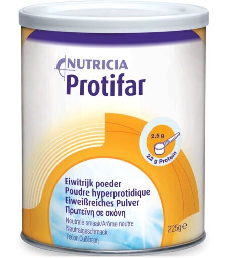 DescriptionProtifar est un aliment diététique destiné à des fins médicales spéciales pour les besoins nutritionnels en cas de dénutrition protéino-énergétique. Nutricia Protifar est utilisé en cas de:apport insuffisant protéique par l'alimentation quotidienne,manque de protéines du à une alimentation déficiente en protéines,un besoin augmenté du aux maladies spécifiques ou aux conditions physiques particulières.Protifar® est un aliment diététique destiné à des fins médicales spéciales pour les besoins nutritionnels en cas de dénutrition protidique. Convient aux patients en cas de restrictions en sodium, potassium et/ou en phosphore. Grâce à son arôme neutre, Protifar peut être ajouté aux boissons et préparations salées ou sucrées. Peut être utilisé pour les préparations cuisinées. Sans gluten.IndicationNutricia Protifar est indiqué en cas de restriction en sodium, potassium et/ou phosphore.Nutricia Protifar è particulièrement indiqué pour:les personnes âgées,les patients convalescents,les femmes enceintes ou qui allaitent,les enfants au cours de la phase de croissance,les adolescents,les convalescents,les sportifs. Grâce à son goût neutre, Protifar peut être incorporé dans:des préparations sucrées : yaourt, fromage blanc, crème anglaise ... Protifar peut être mélangé à la farine lors de la préparation de gâteau , des préparations salées : potage, purées/mixés, mousse de légumes ...des boissons chaudes ou froides : café, chocolat, thé, jus de fruits, eau (dilution à 20 %). Nutricia Protifar ne contient pas de gluten.UsageMélanger la quantité nécessaire de Protifar avec une quantité suffisante de liquide froid pour obtenir une préparation souple et homogène. Diluer dans la boisson ou ajouter à la préparation. La préparation d'une portion doit être consommée dans les 2 heures qui suivent la préparation. Jeter systématiquement les portions non consommées. Après ouverture, bien refermer le couvercle de la boîte. A conserver dans un endroit frais et sec (hors réfrigérateur) et utiliser dans le mois après ouverture. Utiliser la mesurette fournie dans la boîte.IngredientsConcentré de protéines de lait, émulsifiant (lécithine de soja).Information nutritionnelle par 100g de poudre Nutricia Protifar- Valeurs énergétiques: 380 kcal/1615 kJ- Protéines 89g- Glucides dont ...