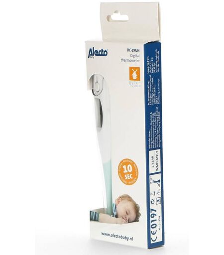 Le Thermomètre Numérique Vert d'Alecto est un thermomètre rapide et précis avec un affichage clair.Toutes les familles devraient posséder un thermomètre de qualité, précis et clair. Ce thermomètre dispose d'un écran LCD avec un affichage clair et une grande taille de police pour une lecture aisée du résultat. Avec un temps de réponse de 10 secondes, il vous indique rapidement la température de votre enfant et vous permet de savoir si sa température a augmenté ou s'il a de la fièvre.Les avantages du thermomètre Alecto :Prise rapide de la température (10 secondes)Mesure précise de la températureGrand écran pour une lecture aiséeEmbout flexibleGrande précision : le thermomètre BC-19GN d'Alecto a fait l'objet de tests approfondis. La température affichée ne diffère jamais de plus de 0,1 °C de la température réelle. Le thermomètre vous prévient en cas de fièvre. Lorsque la température est supérieure à 37,8 °C, le thermomètre émet un signal pour vous en avertir. Autre fonction pratique : le thermomètre garde en mémoire la dernière prise de température, ce qui permet de surveiller l'évolution de la fièvre. Le thermomètre s'éteint automatiquement après l'utilisation de sorte à économiser la batterie. Si malgré cela, la batterie se décharge, elle peut être facilement remplacée. ...