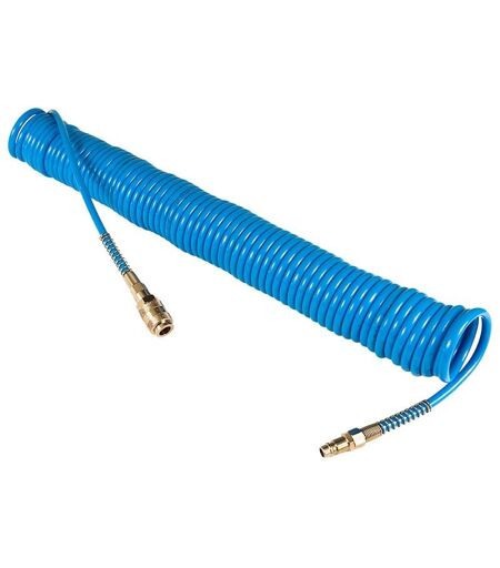 Tuyau spiralé en polyuréthane, équipé d'un raccord rapide et d'un bouchon avec ressorts de renfort. Le tuyau est conçu pour transmettre de l'air comprimé avec une pression de service allant jusqu'à 10 bars. Diamètre intérieur du tuyau : 8 mm Diamètre extérieur du tuyau : 12 mm La longueur utile est de 80 à 90 % de la longueur totale. ...