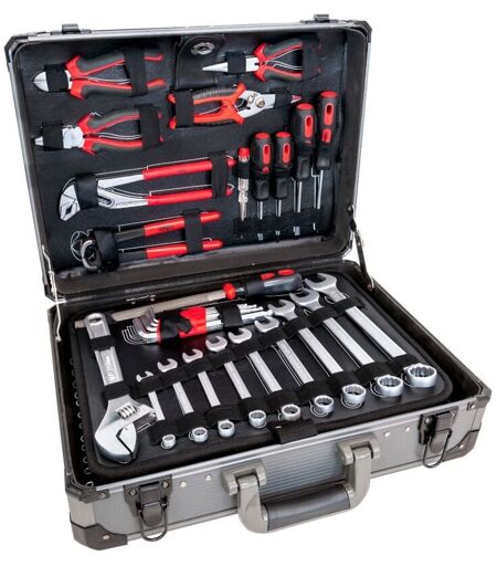 L'ensemble comprend : Testeur électrique 220 - 250 V Jeu de tournevis 4 pièces Pince multiprise 250 mm Tenailles 250 mm Pince universelle Pince coupante latérale 175 mm Pince plate 175 mm Ciseaux à main (universels) Lime Clés Allen (de 1,5 à 10 mm) 9 pièces Clés mixtes (de 8 à 22 mm) Clé à molette 250 mm Poinçons / burins 5 pièces Tournevis de précision avec bouton 3 pièces Pince électrique Pince à circlips à 4 pointes Couteau avec jeu de lames remplaçables Lampe de poche Scie à métaux avec jeu de lames Niveau à bulle Pince à dénuder Douilles 1/4" (de 4 à 14 mm) 13 pièces Douilles 1/2" (de 10 à 32 mm) 13 pièces Poignée à cliquet 1/2" et 1/4" Rallonges 1/4" 2 pièces Rallonges 1/2" 2 pièces Rotules 1/4" et 1/2" Bouton 1/4" Douilles pour bougies 16 et 22 mm Verre doseur Marteau 300 g Pied à coulisse Tournevis à cliquet avec articulation Jeu d'embouts avec adaptateur ...