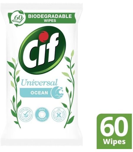 CIF Lingettes Biodégradables Océan - x60 - La lingette assure un résultat impeccable en un seul geste - Les lingettes garantissent un résultat impeccable et sans trace en un seul geste, tout en laissant une agréable odeur de frais dans toutes les pièces de la maison. ...