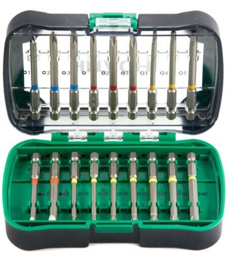 HiKOKI Set d"embouts L 75 mm, 18 pieces Contenu: • 1x PH 1 • 1x PH 2 • 1x PH 3 • 1x PZ 1 • 1x PZ 2 • 1x PZ 3 • 1x Tete plate 4.5 • 1x Tete plate 6.5 • 1x Hexagonal 3 • 1x Hexagonal 4 • 1x Hexagonal 5 • 1x Torx 10 • 1x Torx 15 • 1x Torx 20 • 1x Torx 25 • 1x Torx 27 • 1x Torx 30 • 1x Torx 40 • 1x Porte-embouts magnétique avec systeme de changement rapide> ...