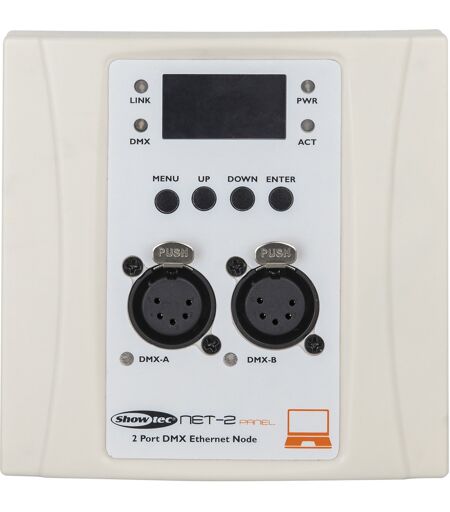 Supporte le protocole Art-Net et sACN, 2 Univers Entrée et sortie DMX, Interface de configuration à distance, PoE (IEEE 802.3af), Les nœuds du panneau Showtec NET-2 sont des dispositifs de routage réseau de pointe qui convertissent Art-Net ou sACN en DMX512 et inversement. Ces panneaux muraux sont idéaux pour réaliser plusieurs points de connexion pour les entrées ou sorties DMX dans votre théâtre professionnel, école, université, salle de congrès, club ou église. L'alimentation peut être simplement fournie via le commutateur NET-5 PoE ou en utilisant une petite alimentation murale locale. Un maximum de 1024 canaux peuvent être transportés sur un seul CAT5. Tous les réglages peuvent être effectués à l'aide du menu facile à utiliser sur l'écran graphique et des boutons situés à l'avant ou via l'interface web à distance accessible au sein du réseau. Compte de connexion par défaut: Admin, mot de passe: Admin. Vous pouvez l'utiliser comme point d'entrée DMX, comme entrée normale ou comme entrée de secours. Les options de sortie DMX sont normales, fusionnant HTP/LTP. Le panneau NET-2 s'adapte à une boîte d'encastrement normale en maçonnerie de 3,5" ou à une boîte murale européenne U50.Données techniques: Alimentation: 12-36 V DC, Alimentation par Ethernet (PoE): Yes, Consommation d'Energie: 6 W, Connecteur Alimentation IN: Phoenix, Connecteur DMX: XLR 5P In/Out, Connecteur DMX in: XLR 5P, Connecteur DMX out: XLR 5P, Connecteur Data in: RJ45, Longueur (mm): 113 mm, Largueur (mm): 113 mm, Hauteur (mm): 33 mm, Poids: 0.275 kg, Classement IP: IP20 (indoor use only), Coffrage: Plastic, Couleur: White, Mode de Contrôle: Art-Net / DMX / TCP IPv4, Canaux DMX: 1024, Protocoles: Art-Net / DMX / RDM / sACN / TCP-IPv4, Afficheur: OLED, Univers: 2 ...