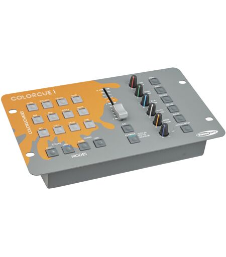 Contrôleur DMX intelligent à 1 fader, Convient pour des spots de 3 à 6 couleurs, 12 couleurs fixes et 12 couleurs utilisateur, 12 pistes fixes et 12 pistes d'utilisateurs avec jusqu'à 99 étapes, Mode manuel, mode automatique et mode contrôlé par le son, Contrôle des gradateurs et des stroboscopes., La gamme ColorCue de Showtec comprend des contrôleurs LED à 6 couleurs pour un contrôle intuitif et intelligent, adapté à toutes les configurations. Leurs boutons rotatifs à 6 couleurs vous permettent d’émettre facilement jusqu’à 6 couleurs (RGB à RGBWA-UV). Il n’est plus nécessaire d’assigner chaque couleur à un fader dédié. Plusieurs couleurs et poursuites fixes ou personnalisées peuvent être déclenchées et ajustées au moyen de claviers dédiés. Les poursuites sont programmables et peuvent comprendre jusqu’à 99 étapes. La gamme ColorCue a été conçue pour vous permettre de tout préparer en un rien de temps.Il existe plusieurs contrôleurs ColorCue différents pour contrôler un seul groupe d’appareils RGB(WA-UV) et jusqu’à 48 groupes d’appareils sur 512 canaux, ainsi que pour commander 48 poursuites/couleurs au maximum. Les ColorCue 3 et 4 sont même équipés d’un écran LCD pour les opérateurs les plus exigeants.Chaque contrôleur ColorCue offre de multiples fonctionnalités et dispose d’un flightcase dédié en option pour un transport sûr et facile. Profitez dès maintenant de conseils gratuits et d’une offre de choix ou découvrez nos produits pour plus d’informations.Le Showtec ColorCue 1 est un contrôleur DMX intelligent à 1 fader pour LED avec 6 canaux pour contrôler facilement le rendement lumineux des luminaires à LED jusqu'à 6 couleurs (RGBWA-UV), adapté à tout lieu. Ses 6 potentiomètres vous permettent de régler rapidement les lumières à la couleur désirée, de 3 couleurs RGB à 6 couleurs RGBWA-UV. Le ColorCue 1 vous permet de créer vos propres 12 couleurs prédéfinies et vous pouvez choisir entre 12 couleurs fixes. Vous pouvez créer jusqu'à 12 programmes (chases) comportant chacun jusqu'à 99 étapes pour changer les couleurs et les effets en boucle. Les chases peuvent être contrôlés en mode manuel, automatique ou contrôlé par le son.Données techniques: Mode de Contrôle: Built-in Program / Manual / Sound / Static Dimmer, Canaux DMX: 6, Protocoles: DMX, Faders: 1, Mémoires: 1212, Alimentation: 100-240 V AC 50/60 Hz (Power adapter), Consommation d'Energie: 10 W, Connecteur Alimentation IN: Low Voltage DC plug, Connecteur DMX out: XLR 3P, Déclencheurs audio: 1, Longueur (mm): 258 mm, Largueur (mm): 150 mm, Hauteur (mm): 79 mm, Poids: 1.1 kg, Unité Rack: 3 U, Coffrage: Metal, Couleur: Gray / Orange ...