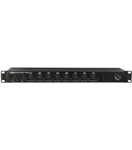 Écran OLED, Prises isolées, 2 prises en entrées, prises en sorties sélectionnables, Plusieurs fonctions de surveillance, Le Booster Pro est l'outil DMX idéal, qui devrait faire partie du matériel de chaque entreprise de location, ou bien du matériel qu'elles installent. Le Booster Pro est un répartiteur DMX et amplificateur opto-isolé. Le Booster Pro disposent de 2 prises IN qui peuvent être assignées à 8 prises OUT (pour chaque prise, vous pouvez assigner une prise A ou B). Le Booster Pro est entièrement compatible au protocole RDM, et permet de contrôler le DMX en temps réel. Dans le cas d'utilisations spéciales, la synchronisation DMX peut être ajustée. En outre, chaque prise OUT du Booster Pro permet de contrôler l'état des fils branchés en temps réel. En cas de panne, un signal acoustique avertira l'utilisateur. L'écran OLED intuitif vous permet de définir rapidement et facilement les différentes fonctions.Données techniques: Alimentation: 100-240 V AC 50/60 Hz, Consommation d'Energie: 5 W, Connecteur Alimentation IN: Power Pro Blue, Connecteur DMX: XLR 3P In/Out, Connecteur DMX in: XLR 3P, Connecteur DMX out: XLR 3P, Longueur (mm): 483 mm, Largueur (mm): 137 mm, Hauteur (mm): 46 mm, Poids: 2 kg, Unité Rack: 1 U, Classement IP: IP20 (indoor use only), Coffrage: Metal / Plastic, Couleur: Black, Mode de Contrôle: DMX, Protocoles: DMX / RDM / USITT, Afficheur: OLED, Univers: 2 ...