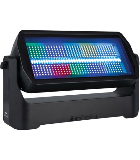 Combinaison washer/stroboscope ultra-brillante, 35 LED CW avec plus de 70 000 lumens, 420 LED RGBW avec jusqu'à 30 400 lumens et un IRC élevé (92), Dix sections contrôlables individuellement, Classé IP65, Le Raccoon S420/4 d’Infinity est un projecteur combiné washer/stroboscope très puissant doté d’un angle de faisceau de 110 degrés. Il comporte dix sections contrôlables individuellement, contenant chacune 42 LED RGBW, qui produisent des effets wash pouvant atteindre jusqu’à 30 400 lumens lorsqu’elles sont combinées. La partie blanche des LED RGBW a un indice de rendu des couleurs (IRC) de 92, ce qui est très élevé pour ce type de produit.L’effet stroboscopique est obtenu grâce à une rangée de 35 LED CW extrêmement lumineuses, chacune d’entre elles étant capable de produire un effet stroboscopique de 20 W, ce qui représente une puissance stroboscopique LED totale de 700 W (plus de 70 000 lumens) ! Les LED stroboscopiques sont dotées d’une lentille spéciale pour optimiser l’angle de sortie. Les LED sont positionnées sur une ligne située au centre du projecteur, entre les LED wash. Lorsqu’elles sont utilisées en continu, leur puissance est limitée à 12 W (plus de 54 200 lumens) pour éviter qu’elles ne dégagent une chaleur trop importante.Les LED sont soudées sur un circuit imprimé noir, afin que les stroboscopes restent invisibles lorsqu’ils ne sont pas utilisés. Les ventilateurs de refroidissement peuvent être réglés sur un mode lent pour qu’ils restent silencieux. Grâce au support en L disponible en option, le boîtier (doté d’un indice de protection IP65) peut être installé verticalement ou incliné, tout en restant équilibré (le support n’est soumis à aucun couple de force). D’autres accessoires sont également disponibles en option: un top hat, un volet coupe flux, ainsi qu’une gamme de diffuseurs.Données techniques: Type de source lumineuse: LED, Quantité source lumineuse: 420, Puissance source lumineuse: 2 W, Couleur Led: CW / RGBW, Flux lumineux (Total): 96661 lm, Mode de Contrôle: DMX / Manual, Protocoles: DMX / RDM, Wireless: LumenRadio, Gradateur: 0-100 %, Strobe: 0-20 Hz, Alimentation: 100-240 V AC 50/60 Hz, Consommation d'Energie: 860 W, Connecteur Alimentation IN: Power Pro True, Connecteur d'alimentation Sortie: Power Pro True, Connecteur DMX: XLR 5P In/Out, Hauteur (mm): 351 mm, Largueur (mm): 617 mm, Profondeur (mm): 157 mm, Poids: 17.8 kg, Classement IP: IP65, Coffrage: Aluminium, Couleur: Black ...
