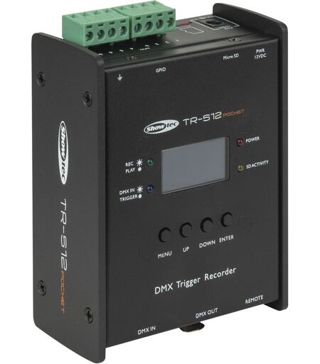 Communication bidirectionnelle avec le panneau mural de commande à distance, 6 déclencheurs externes universels (GPIO), Panneau mural de commande à distance conçu pour le TR-512 Install/Pocket (50827/28), Ports DMX avec isolation optique, Fonction enregistrement et lecture, Le TR-512 Pocket est un enregistreur/lecteur DMX qui vous permet de déclencher facilement votre spectacle lumière. Grâce à la dernière mise à jour du logiciel, un nouveau mode de lecture en Veille offre de nouvelles fonctionnalités.Le TR-512 Pocket peut enregistrer et lire plusieurs shows en les stockant sur la carte micro SD intégrée. Cette carte dispose d’une mémoire suffisante pour enregistrer des shows qui durent 24 heures. Chaque show peut se lire en boucle ou en une seule fois. Vous pouvez paramétrer le lancement automatique dès l’allumage de l’appareil ou un lancement en différé. Les 6 ports GPIO existants vous permettent de lancer ou d’arrêter vos shows à l’aide de déclencheurs externes tels que des interrupteurs standard, des relais, des détecteurs de mouvement, etc.Ce nouveau mode de lecture ajoute un mode Spectacle et un mode Relais au mode Scène par défaut. Le mode Scène est parfaitement adapté pour un état statique entre deux spectacles actifs. Lorsqu’aucun fichier n’est sélectionné, il utilise une occultation par défaut avec tous les canaux réglés sur zéro. Le mode Spectacle lit en boucle un spectacle sélectionné, ce qui s’avère utile pour obtenir un divertissement ininterrompu ou des effets de décor en l’absence d’événements déclenchés. Le mode Relais permet de transmettre un signal DMX reçu d’une autre source vers une installation d’éclairage connectée à travers l’entrée et la sortie DMX du TR-512.Vous pouvez configurer la communication bidirectionnelle avec le Télécommande mural pour TR-512 Install/Pocket (références 50827, 50828) grâce au terminal RJ45 à l’aide d’un câble standard Cat5. Le TR-512 Pocket est l’outil qu’il vous faut pour déclencher vos shows ou vos effets dans des parcs à thème, des musées, des boutiques ou tout autre type de projet d’intégration.Veuillez noter que cette TR-512 Pocket n'est pas compatible avec le TR-512 Wallpanel (référence 50824).Données techniques: Type Mémoire: SD-Card, Alimentation: 100-240 V AC 50/60 Hz (Power adapter), Alimentation par Ethernet (PoE): No, Consommation d'Energie: 6 W, Connecteur Alimentation IN: Low Voltage DC plug, Connecteur DMX: XLR 3P In/Out, Connecteur Data in: RJ45, Longueur (mm): 115 mm, Largueur (mm): 85 mm, Hauteur (mm): 45 mm, Poids: 0.45 kg, Classement IP: IP20 (indoor use only), Coffrage: Metal, Couleur: Black, Mode de Contrôle: DMX / GPIO / Manual / Remote, Canaux DMX: 512, Protocoles: DMX, Afficheur: OLED, Univers: 1 ...