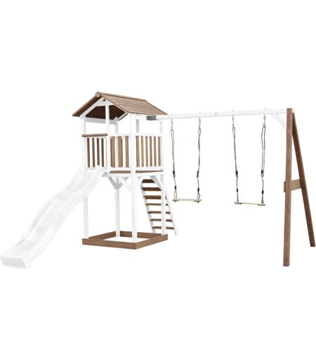AXI Beach Tower Aire de Jeux avec Toboggan en Blanc, 2 Balançoires & Bac à Sable Grande Maison enfant extérieur en marron & Blanc Cabane de Jeu en Bois