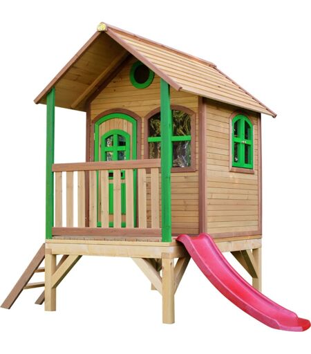 Tom Maison Enfant avec Toboggan rouge Aire de Jeux pour l'extérieur en marron & Vert Maisonnette / Cabane de Jeu en Bois fsc - AXI