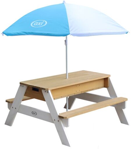 AXI Nick Table Sable et Eau / Pique Nique avec Parasol en Bois Marron et Blanc 95 x 97 x 48 cm Avec Couvercle, Boîtes de Rangement & Parasol Extérieur