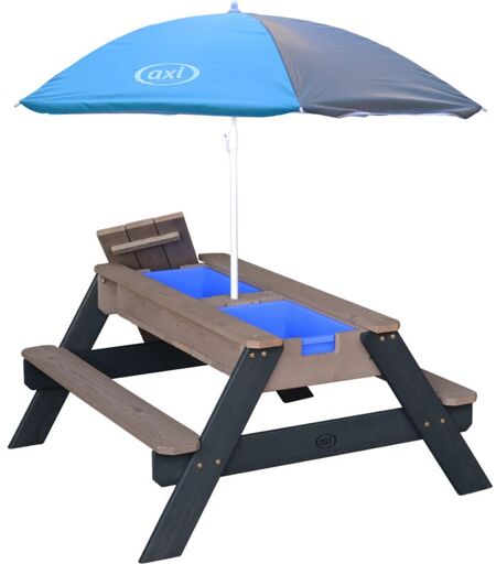 AXI Nick Table Sable et Eau / Pique Nique avec Parasol en Bois Gris 95 x 97 x 48 cm Avec Couvercle, Boîtes de Rangement & Parasol Extérieur pour le