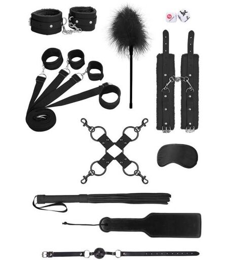 Le Kit d'Attaches de Lit Supreme de Ouch! est exactement ce qu’il vous faut pour enrichir votre pratique du bondage et du BDSM en couple ! Éveillez tous vos sens et créez des scénarios érotiques très excitants avec ce kit qui contient : * 4 sangles avec menottes de poignets et chevilles. * 1 paire de menottes pour poignets en cuir * 1 paire de menottes pour chevilles en cuir * 1 bâillon boule * 1 masque en satin * 1 martinet * 1 paddle en cuir de 30,5 cm de long * 1 plumeau de 28 cm de long * 1 attache hogtie à 4 mousquetons * 2 dés coquins Attachez votre partenaire avec les menottes, bandez ses yeux avec le masque et empêchez-le de parler avec le bâillon. Infligez-lui de douces punitions avec le martinet et le plumeau, variez les plaisirs et les accessoires et vivez des expériences uniques ! Laissez-vous aller à vos fantasmes avec ce kit parfait pour découvrir les jeux de soumission et de domination ! ...