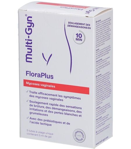 L'action Multi-Gyn FloraPlus est fabriqué à partir d’ingrédients naturels. En plus des extraits de plantes, le gel contient des composants prébiotiques. Les composants prébiotiques stimulent la croissance des lactobacilles utiles et contribuent à la santé de la flore vaginale. Multi-Gyn FloraPlus traite les mycoses vaginales, soulage les symptômes et prévient le retour de l'infection. Indications Traite les mycoses vaginales Soulage les démangeaisons et l'irritation Optimise le pH vaginal Contribue à la santé de la flore vaginaleConseils d'utilisationPour le traitement des mycoses vaginales, appliquez 1 tube par jour, à l'heure du coucher, pendant 5 jours consécutifs. Pour la prévention (du retour) de mycoses vaginales, appliquer 1 tube avant le coucher, tous les 3 jours. En soutien durant la prise d'antibiotiques, appliquer chaque jour pendant les 3 premiers jours, puis tous les 3 jours.CompositionGalactoarabinan Polyglucuronic acid Crosspolymer*, Monosaccharides, Amino Acids, Vitamins *Complexe 2QR, polysaccharides bioactifs brevetés d'origine végétaleConditionnement Tube de 25 ml ...
