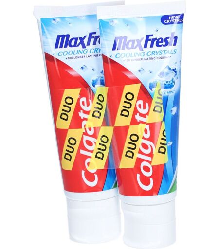 Colgate® Max Fresh Cool Mint Pas de dentifrice avec Cooling Crystals, offre une protection contre les caries et assure une haleine fraîche Pas de dentifrice avec Cooling Crystals, qui se dissout dans la bouche. Protège les dents contre les caries et assure une haleine fraîche. Le dentifrice Colgate Max Fresh Cooling Crystals contient de petits cristaux qui procurent une toute nouvelle sensation de fraîcheur lors du brossage des dents. La technologie FreshFX offre un effet de fraîcheur qui dure 10 fois plus longtemps qu'un dentifrice classique au fluor. Convient à partir de 7 ans. Une sensation de fraîcheur surprenante Maintient la blancheur des dents Rafraîchit et nettoie la cavité buccale Procure une haleine fraîche Nettoie les dents en profondeur Lutte contre les caries Brossez-vous les dents au moins deux fois par jour ou suivez les recommandations de votre dentiste. 2 tubes x 75 ml ...