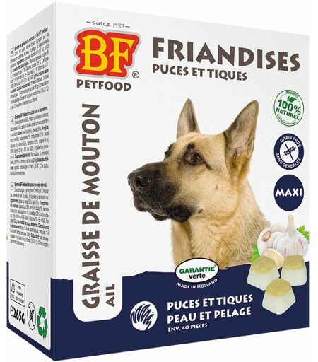 Bonbons BIOFOOD pour faciliter la digestion de votre chien.Aux extraits d'ail et à base de graisse de mouton.Paquet de 40 bonbons. Comment entretenir le transit de votre animal tout en lui faisant plaisir ? Les bonbons BIOFOOD "puces et tiques" facilitent la digestion et aident à éliminer les toxines. Ces bonbons à base de graisse de mouton et aux extraits d'ail agissent afin d'accélérer la digestion et de la rendre plus facile. Ils favorisent également l'assainissement et la purification de l'épiderme, tout en tonifiant et enrendant la peau de votre animal plus résistante. Ces bonbons rendront le pelage de votre animal soyeux, tout en lui donnant de l'énergie. Ils serviront également de protection naturelle contre les parasites. COMPOSITION ET CARACTERISTIQUES : Graisse de mouton (95 %), ail (5 %), Matières grasses brutes 95%, Protéines brutes 1%, Cendres brutes 0,5%, Fibres brutes 1%, Humidité 0,6%, Glucides 1,9%, Vitamine A IE 2000, Vitamine D3 IE ...