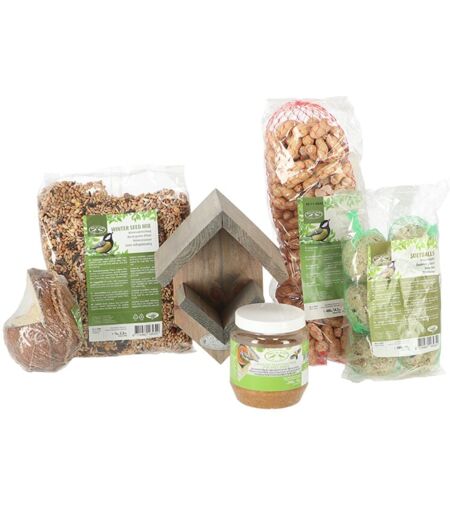 Ce pack contient tout le nécessaire pour attirer les oiseaux dans le jardin. Le pack contient une maison avec support pour beurre de cacahuète et une variété de nourriture, comme les mix de graines hiver, noix de coco fourrée, filet de cacahuètes, boules de graisse et beurre de cacahuètes. Matériaux : Bois pin de Monterey, Blé, sorgho, millet, tournesol noir, tournesol rayé, maïs cassé, graines de chanvre, haricot, petite avoine, vesce, pois, avoine noire, Suif de bœuf, blé, maïs, sorgho, graines de tournesol rayées, carbonate de calcium. Dimensions du produit : L 31,9 x P 18,8 x H 23 cm. pack complet avec une maison avec support pour beurre de cacahuète avec différents types de nourriture inclus . Couleur : Beige. Matière: Bois. Hauteur : 23 cm. Longueur : 31.9 cm. Profondeur : 18.8 cm. Usage : Extérieur. Animaux : Oiseaux ...