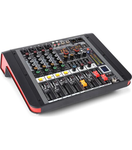 Mélangeur de musique de table avec amplificateur intégré et de nombreuses caractéristiques attrayantes. Les caractéristiques comprennent des interrupteurs de sourdine et de solo sur chaque canal, un lecteur USB intégré avec affichage numérique et un récepteur BT pour diffuser de la musique sur le mélangeur pendant la pause. Idéal pour les installations en direct et les petits groupes.4 Entrée micro/ligne mono équilibrée (Combi XLR/Jack), Alimentation fantôme +48V, Entrée ligne stéréo (RCA), Processeur Multi-FX avec 16 presets, Commutateur Solo par canal (PFL), Interrupteur marche/arrêt par canal, Réglages Hi, Mid et Low pour chaque canal, FX, Pan, Trim réglables par canal, Sorties principales symétriques stéréo (XLR), Sorties séparées pour le casque et l'enregistrement stéréo, Égaliseur à 7 bandes, Amplificateur intégré de 2x 200W RMS, Lecteur USB intégré avec affichage numérique, Récepteur BT pour le streaming audio, VU-mètre à LED et LED de crête, Options de lecture: Streaming BT, USB, Connexions d'entrée: Jack 6,3 mm, RCA, USB, XLR (3 broches), Connexions de sortie: Jack 6,3 mm, NL-4, RCA, Préréglages: 16, Type d'effets: Delay, Echo, Hall, Ping pong delay, Reverb delay, Room, Résolution DSP: 24 bits, Canaux de sortie: 2, Puissance de sortie: RMS @ 8 Ohm par canal: 200W, Réponse en fréquence: 10Hz - 45.000Hz, THD: 112dB, Niveau de sortie: Maître: 1V, Alimentation électrique: 220-240VAC 50Hz, Dimensions (L x l x H): 330 x 340 x 125mm, Poids: 7.0000 ...