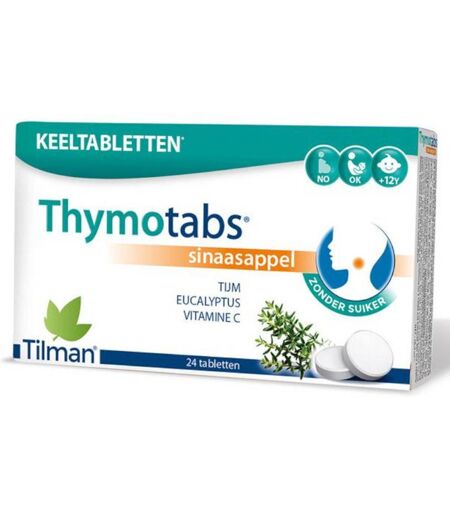 DescriptionLe thym est une plante aromatique typique des régions méditerranéennes. Depuis l’Antiquité, le thym est connu pour son action apaisante pour la gorge. On l’utilise principalement pour calmer les irritations de la gorge et les enrouements.En plus du thym, les pastilles Thymotabs orange contiennent de la vitamine C, essentielle pour renforcer les défenses naturelles de l'organisme contre les refroidissements. Les pastilles Thymotabs orange sont donc idéales pour lutter contre les agressions hivernales et apaiser les gorges irritées, encombrées, ou enrouées.Les Thymotabs orange , arômatisées à l'orange, aident à dégager et rafraîchir les voies respiratoires. Leur goût délicieusement fruité séduira autant les petits que les grands. IndicationRiches en thym et en vitamine C, les pastilles Thymotabs orange procurent une sensation de douceur apaisante pour la gorge.ApplicationVous souhaitez apaiser votre gorge tout en profitant d’un petit moment de douceur fruitée ? Vous apprécierez les Thymotabs orange .Enfants de 4 à 12 ans : 1 à 4 pastilles par jourAdultes et enfants de plus de 12 ans : 1 à 8 pastilles par jourFemmes enceintes : 1 à 4 pastilles par jourLaissez fondre les pastilles lentement dans la bouche.Thymotabs orange est compatible avec l’homéopathie (sans menthe) et convient aux diabétiques (sans sucre). ...