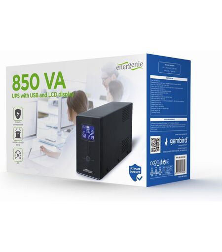 Gembird EG-UPS-032. capacité de la puissance de sortie: 0,85 kVA, Puissance de sortie: 510 W, Forme d'onde: Sinus. Types de sortie AC: Coupleur C13, Nombre de prises en sortie: 3 sortie(s) CA. Technologie batterie: Sealed Lead Acid (VRLA), Tension des piles: 12 V, Temps de secours type au chargement complet: 20 min. Couleur du produit: Noir, Type d'écran: LCD. Certificats de conformité: RoHS ...