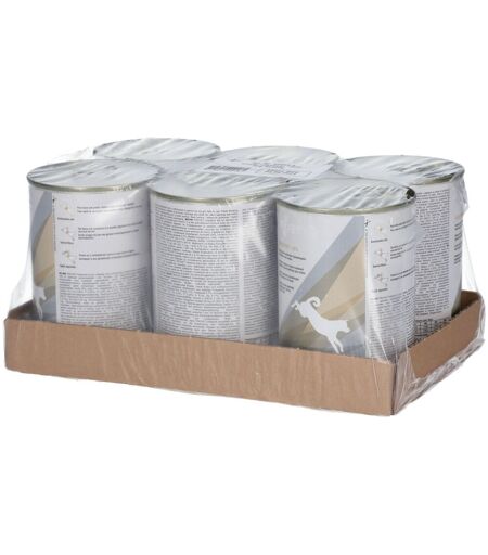 L'utilisation de la pomme de terre comme source de glucides et l'ajout de fibres font de Trovet DPD Intestinal Chien un aliment hautement digestible et contribuent à la santé du système digestif. De plus, le nombre très limité d'ingrédients contribue à faciliter la digestion. Trovet DPD contient en outre une source unique de protéines (canard) et une source unique de glucides (pomme de terre), deux ingrédients qui provoquent rarement des réactions d’hypersensibilité. Cet aliment convient aux chiens souffrant d'hypersensibilité alimentaire. Propriétés de TROVET Intestinal DPD Chien Alimentation hypoallergénique élaborée à partir d'une source unique de protéines et de glucides (canard et pomme de terre). Les fructo-oligosaccharides (FOS) contribuent au bon équilibre de la flore intestinale. Hautement digestible, cette alimentation participe à la santé de la paroi intestinale. Prévention des réactions immunologiques (allergie alimentaire) ou non immunologiques (intolérance alimentaire) qui se manifestent sous la forme de problèmes cutanés ou de troubles gastro-intestinaux (diarrhée, vomissements). Contribue à la disparition progressive des lésions cutanées causées par un prurit (grattage, léchage et mordillage en cas de démangeaisons) lors du passage à une alimentation hypoallergénique. Indications: Hypersensibilité alimentaire Cure d’élimination Allergie alimentaire et intolérance alimentaire Affections du système gastro-intestinal Diarrhée, inflammation intestinale Chiots sauf ; voir contre-indications Contre-indications: Hypersensibilité à la protéine animale du canard. Pancréatite, encéphalopathie hépatique. Hyperlipidémie. Prescription d'une alimentation contenant peu de protéines et/ou de lipides. Conseils d'utilisation: Consultez les dosages recommandés indiqués sur l'emballage pour que votre animal de compagnie maintienne un poids idéal. RECOMMANDATION ALIMENTAIRE PAR JOUR Poids Quantité d'alimentation (min-max) 5 kg 310 - 420 g 10 kg 510 - 690 g 20 kg 845 - 1155 g 30 kg 1135 - 1580 g 40 kg 1400 - 1955 g 50 kg 1645 - 2310 g 60 kg 1870 - 2670 g Précautions d’emploi: Tenir hors de portée des enfants. Conserver au frais et au sec, ainsi qu’à l’abri de la lumière. Composition: Viande et sous-produits animaux (canard), sous-produits végétaux (pomme de terre, pulpe de betterave, cellulose, inuline, gomme de guar), minéraux. Constituants analytiques: Protéines brutes 8,5%, matières grasses brutes 6,3%, cendres brutes 2,0%, fibres brutes 1,0%, humidité 80,0%, glucides 2,2%, vitamine A 2 025 IE, vitamine D3 136 IE, vitamine E 10 mg, calcium 0,32%, phosphore 0,21%, sodium 0,16%, potassium 0,20%, zinc 20 mg, énergie (ME) 4,3 MJ, énergie (ME) 1022 kcal (par kg). Additifs par kg: Vitamine A 3.000 UI, Vitamine D3 200 UI, Vitamine E 30 mg, Zinc 15 mg, Iode 0,75 mg. Conditionnement: 6 x 400 g ...