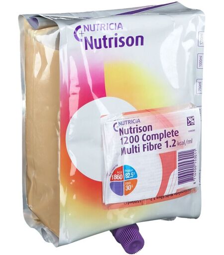 Il est important d'avoir une alimentation variée et équilibrée et un mode de vie sain.Nutrison 1200 Complete Multi Fibre est une alimentation par sonde complète, prête-à-l’emploi, avec fibres. A utiliser sous surveillance médicale.Sans gluten et pauvre en lactose. Contient du lait, du soja, du poisson.Nutrison 1200 Complete Multi Fibre est une denrée alimentaire destinée à des fins médicales spéciales. Pour les besoins nutritionnels en cas de dénutrition associée à une maladie chez des patients avec des besoins énergétiques et/ou hydriques réduits. Composition:Eau, dextrine-maltose, huiles végétales (tournesol, colza, huile TCM (huile de coco, huile de palmiste)), protéines de lactosérum (de lait de vache), fibres alimentaires (inuline, oligofructose, gomme arabique, polysaccharide de soja, cellulose, amidon résistant), caséine (de lait de vache), protéines de pois, protéines de soja, citrate de potassium, émulsifiant (lécithine de soja, chlorure de sodium, huile de poisson, orthophosphate de magnesium, carbonate de calcium, hydroxide de potassium, phosphate tri-calcique, caroténoïdes (contient du soja) (ß-carotène, lutéine, oléorésine de lycopène de tomate), chlorure de choline, L-ascorbate de sodium, citrate de sodium, lactate ferreux, sulfate de zinc, nicotinamide, acétate de DL-α-tocophérol, acétate de retinol, gluconate de cuivre, sulfate de manganèse, sélénite de sodium, D-pantothénate de calcium, chlorure de chrome, cholécalciférol, chlorhydrate de thiamine, D-biotine, acide ptéroylmonoglutamique, chlorhydrate de pyridoxine, riboflavine, iodure de potassium, fluorure de sodium, molybdate de sodium, phytoménadione, cyanocobalamine.Valeur nutritionnelle: Pour 100 ml Kilocalories 124 kcal Kilojoules 525 kJ Densité énergétique 1,24 kcal/ml/g Unités de pain 1,3 BE Protéines 18 En% Glucides 48 En% Matières grasses 31 En% Fibres 3 En% Matières grasses Matières grasses 4,3 g saturés 1,1 g MCT 0,6 g - mono-insaturés 2,3 g - poly-insaturés 0,8 g Acides gras oméga-3 0,198 g Acides gras oméga-6 0,545 g Glucides Glucides 15 g Sucre 1 g Glucose 0,2 g Fructose 0 g Lactose <0,025 g Maltose 0,8 g Saccharose 0 g Polysaccharide 13,7 g Amidon 0 g Fibres alimentaire Fibres alimentaires 2 g Fibres solubles 1,6 g Fibres insolubles 0,4 g Protéines Protéines 5,5 g Sel Sel 0,38 g Vitamines Vitamine A (RE) 123 μg Vitamine D 2 μg Vitamine E (TE) 1,9 mg Vitamine K 8 μg Vitamine B1 0,23 mg Vitamine B2 0,24 mg Niacine (NE) 2,7 mg Acide panthoténique 0,8 mg Vitamine B6 0,26 mg Acide folique 40 μg Vitamine B12 0,32 μg Biotine 6 μg Vitamine C 15 mg Minéraux Sodium 150 mg Potassium 225 mg Chloride 145 mg Calcium 120 mg Phosphore 96 mg Magnesium 27 mg CA/P-Quotient 1,3 mg Oligo-éléments Fer 2,4 mg Zinc 1,8 mg Cuivre 0,27 mg Manganèse 0,5 mg Fluoride 0,15 mg Molybdène 15 μg Sélénium 8,5 μg Chrome 10 μg Iode 20 μg Andere Stoffe Choline 55 mg Carotinoide 0,3 mg Taurine 0 mg Osmolarité 345 mosmol/l Osmolalité 440 mOsmol/kg Inosine 5 monophosphate 100 mg Eau Eau 80 g Conseil... ...