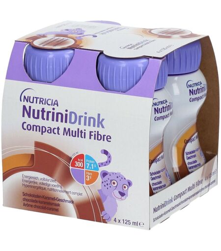 Complément alimentaire à utiliser dans le cadre d'une alimentation variée, équilibrée et d'un mode de vie sain.NutriniDrink Compact Multi Fibre est une denrée alimentaire destinée à des fins médicales spéciales. Pour les besoins nutritionnels en cas de dénutrition associée à une maladie ou un retard de croissance, pour les enfants à partir de 1 an. A utiliser sous contrôle Médical.NutriniDrink Compact Multi Fibre est un complément nutritionnel oral hyperénergétique complet avec fibres pour les enfants à partir de 1 an. Il fournit dans une petite bouteille de 125 ml, des protéines, de l’énergie, des fibres, des vitamines et des minéraux pour faire face aux éventuelles carences.NutriniDrink Compact Multi Fibre est disponible en 3 saveurs différentes : neutre, fraise ou chocolat-caramelNutriniDrink Compact Multi Fibre a été développé pour assurer l’observance à la thérapie nutritionnelle. Il contient 2,4 kcal par ml et délivre 300 kcal dans une bouteille de 125 ml.NutriniDrink Compact Multi Fibre est une denrée alimentaire destinée à des fins médicales spéciales. Pour les besoins nutritionnels en cas de dénutrition associée à une maladie ou un retard de croissance. Le médecin ou le diététicien de votre enfant détermine la quantité. NutriniDrink Compact Multi Fibre ne contient pas de gluten. Il contient du lait, du soja. IngrédientsEau, sirop de glucose, huiles végétales (colza, tournesol), protéines de lait de vache, fibres alimentaires (inuline, oligofructose, gomme arabique, polysaccharides de soja, cellulose, amidon résistant), émulsifiant (lécithine de soja), citrate de potassium, orthophosphate di-potassique, orthophosphate de magnésium, chlorure de sodium, citrate de sodium, phosphate de calcium, chlorure de choline, L-ascorbate de sodium, hydroxyde de potassium, taurine, lactate ferreux, arôme, sulfate de zinc, L-carnitine, acétate de rétinol, gluconate de cuivre, nicotinamide, D-pantothénate de calcium, acétate de DL-α-tocophérol, chlorhydrate de thiamine, sulfate de manganèse, riboflavine, chlorhydrate de pyridoxine, fluorure de sodium, bêta-carotène, acide ptéroylmonoglutamique, chlorure de chrome, iodure de potassium, molybdate de sodium, D-biotine, sélénite de sodium, cholécalciférol, phytoménadione, cyanocobalamine.Données nutritionnelles Pour 100 mlEnergie1006 kJ / 240 kcalMatières grasses10,9 gdont saturés1,0 gdont mono-insaturés6,5 gdont poly-insaturés3,4 gGlucides28,5 gdont sucre14,9 gFibres2,4 gProtéines0,22 gSel0,22 gVitamine A105 µgVitamine D3,12 µgVitamine E3,12 mgVitamine K10,5 µgThiamine0,36 mgRiboflavine0,38 mgNiacine0,95 mgPacide pantothénique0,79 mgVitamine B60,29 mgAcide folique43,2 µgVitamine B120,41 µgBiotine9,36 µgVitamine C24,0 mgSodium89,0 mgPotassium221 mgChlore89,0 mgCalcium168 mgPotassium153 mgMagnésium26,4 mgFer2,4 mgZinc2,4 mgCuivre0,18 mgManganèse0,16 mgFluor0,17 mgMolybdène10,5 µgSélenium7,50 µgChrome6,00 µgIode24.0µgL-Carnitine4,56 mgCholine48,0 mgTaurine18,0 mgOsmolarité600 mOsmol/LConseils d'utilisationsA... ...