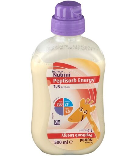Il est important d'avoir une alimentation variée et équilibrée et un mode de vie sain.Nutrini Peptisorb Energy est une denrée alimentaire destinée à des fins médicales spéciales pour les besoins nutritionnels en cas de maladies associées à une dénutrition chez des patients avec une malabsorption et/ou maldigestion. A utiliser sous surveillance médicale.Suite à une maladie, une opération ou un traitement, il est possible qu’un enfant ne puisse pas ou ne sache pas manger. Pour ces enfants, une alimentation qui satisfait tous leurs besoins est d’autant plus importante. L’alimentation par sonde peut alors être utilisée pour remplacer l’alimentation normale, en partie ou en totalité.Nutrini Peptisorb est une alimentation par sonde complète, prête à l'emploi, riche en énergie. Elle a été spécialement développée pour les enfants à partir d’un an qui ont des problèmes digestifs. Ces troubles peuvent être liés à différentes maladies ou à un traitement tel qu'une radio ou une chimiothérapie.Nutrini Peptisorb Energy est à base de peptides, et contient des fibres. Nutrini Peptisorb Energy est sans gluten. Contient du lait, du soja et du poisson.Nutrini Peptisorb Energy est une denrée alimentaire destinée à des fins médicales spéciales en cas de dénutrition associée à une maladie avec une malabsorption et/ou maldigestion.Composition:Eau, dextrine-maltose, huiles végétales (triglycérides à chaîne moyenne (huile de coco et huile de palme), graine de soja, maïs), hydrolysat de protéine de lactosérum (de lait de vache), amidon de maïs, correcteurs d'acidité (acide malique, acide citrique), fibres alimentaires (inuline, oligofructose), lactate de potassium, orthophosphate de calcium, huile de poisson, chlorure de sodium, orthophosphate de magnésium, citrate de calcium, orthophosphate de magnésium, chlorure de choline, L-ascorbate de sodium, chlorure de calcium, taurine, inositol, lactate ferreux, sulfate de zinc, L-carnitine, acétate de DL-α-tocophérol, nicotinamide, D-pantothénate de calcium, gluconate de cuivre, sulfate de manganèse, chlorhydrate de thiamine, riboflavine, chlorhydrate de pyridoxine, fluorure de sodium, acétate de rétinol, bêta-carotène, acide ptéroylmonoglutamique, iodure de potassium, chlorure de chrome, D-biotine, sélénite de sodium, cholécalciférol, phytoménadione.Valeur nutritionnelle: Pour 100mlÉnergie150kcal/630kJLipides (40% EN) :6,6gSaturés4g- TCM3,4gMono-insaturés0,8gPoly-insaturés1,8g- Acide linoléique1,64g- Acide α-linolénique0,164gAA4,61mgDHA53,9mgEPA13,8mgGlucides (48% EN) :18,6gGlucose0,1gLactose0,1gMaltose0,2gPolysaccharides16,7gAutres1,5gFibres (1% EN)<0,5gProtéines (11% EN) :4,2gProtéines de lactosérum 1,2gSel0,24gEau77mlMinéraux : Na95mgK168mgCl143mgCa130mgP99mgMg23mgOligo-éléments : Fe1,5mgZn1,5mgCu0,11mgMn0,15mgF0,1mgMo7μgSe4,7μgCr3,7μgI15μgVitamines : A62μgD1,9μgE2mg (α-ET)K6μgThiamine0,23mgRiboflavine0,24mgNiacine1mgNiacine1,7mg ENAcide pantothénique0,5mgB60,18mgAcide folique27μgB120,26μgBiotine6μgC15mgAutres... ...