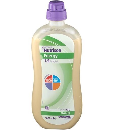 Il est important d'avoir une alimentation variée et équilibrée et un mode de vie sain.Nutrison Energy est une denrée alimentaire destinée à des fins médicales spéciales. Pour les besoins nutritionnels en cas de dénutrition associée à une maladie chez des patients avec des besoins énergétique élevés.Alimentation par sonde complète, hyperénergétique, sans fibre, prête-à-l’emploi. Sans gluten et pauvre en lactose. À utiliser sous surveillance médicale.Contient du lait, du soja, du poisson.Composition:Eau, dextrine-maltose, huiles végétales (tournesol, colza, TCM (huile de coco, huile de palmiste)), protéines de lactosérum (du lait de vache), caséinates (du lait de vache), protéines de pois, protéines de soja, émulsifiant (lécithine de soja), orthophosphate de magnésium, citrate de potassium, citrate de sodium, carbonate de calcium, huile de poisson, chlorure de potassium, hydroxide de potassium, phosphate tri-calcique, caroténoïdes (contient du soja) (ß-carotène, lutéine, oléorésine dem lycopène de tomate), chlorure de choline, chlorure de sodium, L-ascorbate de sodium, lactate ferreux, sulfate de zinc, nicotinamide, acétate de DL-α-tocophérol, acétate de rétinol, gluconate de cuivre, sulfate de manganèse, sélénite de sodium, D-pantothénate de calcium, chlorure de chrome, D-biotine, cholécalciférol, chlorhydrate de thiamine, acide ptéroylmonoglutamique, chlorhydrate de pyridoxine, riboflavine, iodure de potassium, fluorure de sodium, molybdate de sodium, phytoménadione, cyanocobalamine.Valeur nutritionnelle: Pour 500 ml Valeur énergétique kJ 6300 kcal 1500 Protéines g 60 Azote g 10 Glucides g 183 - Sucres g 11 - Polysaccharides g 169 Lipides g 58 - saturés g 15 - mono-insaturés g 17 - poly-insaturés g 11 - acide linoléique g 7,3 - acide α-linolénique g 1,95 - EPA + DHA mg 337 Fibres g - Eau ml 780 Minéraux : - Sodium mg 1340 - Potassium mg 2010 - Chlorures mg 1000 - Calcium mg 1080 - Phosphore mg 1080 - Magnésium mg 340 - Fer mg 24 - Zinc mg 18 - Cuivre mg 2,7 - Manganèse mg 5 - Iode µg 200 - Fluor mg 1,5 - Molybdène µg 150 - Sélénium µg 86 - Chrome µg 100 Vitamines : - A µg 1230 - D µg 15 - E mg Eα-T 19 - K µg 80 - B1 mg 2,3 - B2 mg 2,4 - B5 (ac pantothénique) mg 8 - B6 mg 2,6 - B9 (ac folique) µg 400 - B12 µg 3,2 - C mg 150 - Biotine µg 60 - PP (niacine) mg EN 27 Choline mg 550 Ratio C/N kcal/g d'N 130 Concentration kcal/ml 1,5 Osmolarité mOsm/l 360 Conseil d'utilisation:Vérifier l’aspect du produit avant utilisation. Bien agiter le produit. Précautions d'emploi:Ne pas diluer, ni ajouter de médicaments au produit. À conserver de préférence dans un endroit frais et sec. Administrer à température ambiante. Après ouverture, (opercule percé et tubulure retirée), la bouteille refermée se conserve au réfrigérateur pendant 24 h maximum. Lorsque la bouteille est connectée à la tubulure (manipulation aseptique, système fermé), elle a un temps de suspension de 24 h maximum.Si l’opercule a été retiré (utilisation en système ouvert), la bouteille a un temps... ...