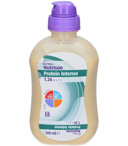 Il est important d'avoir une alimentation variée et équilibrée et un mode de vie sain. Nutrison Protein Intense est une denrée alimentaire destinée à des fins médicales spéciales. Pour les besoins nutritionnels en cas de dénutrition associée à une maladie chez des patients gravement malades requérants un besoin accru en protéines comme pour les patients se trouvant aux soins intensifs, en oncologie, en infection grave, en traumatologie ou bien encore en unité de grands brûlés. Egalement pour les patients ayant un apport insuffisant en protéines et/ou avec une diminution de la force musculaire. En raison d'une maladie, d'une opération ou d'une prise en charge nutritionnelle, il est possible que vous ne puissiez pas ou ne vouliez pas manger. Une bonne alimentation est particulièrement importante et l'alimentation par sonde peut alors être une bonne alternative. Ce produit est utilisé en complément ou en remplacement total d'un régime alimentaire normal. Ce produit est recommandé par un médecin ou un diététicien pour les besoins nutritionnels en cas de dénutrition et doit être pris sous surveillance médicale. Nutrison Protein Intense ne contient pas de gluten, pauvre en lactose. Contient du lait, du soja, du poisson. Il existe différents types d'alimentation par sonde Nutrison qui sont adaptés aux besoins de chaque patient. Votre médecin ou diététicien saura quel régime vous convient le mieux. Bénéfices A partir de 12 ans Sans gluten Ingrédients Eau, dextrine-maltose, protéines de lactosérum (de lait de vache), huiles végétales (tournesol, colza, TCM (huile de coco, huile de palmiste)), caséinate de sodium (de lait de vache), isolat de protéines de pois, protéines de soja, correcteur d'acidité (acide citrique), huile de poisson, émulsifiant (lécithine de soja), hydroxyde de potassium, chlorure de potassium, hydroxyde de calcium, caroténoïdes (contient du soja) (β-carotène, lutéine, oléorésine de lycopène de tomate), chlorure de choline, citrate de sodium, hydroxyde de magnésium, L-ascorbate de sodium, lactate ferreux, sulfate de zinc, sulfate de manganèse, gluconate de cuivre, D-pantothénate de calcium, acétate de DL-α-tocophérol, chlorhydrate de thiamine, chlorhydrate de pyridoxine, riboflavine, fluorure de sodium, acétate de rétinol, chlorure de chrome, acide ptéroylmonoglutamique, iodure de potassium, D-biotine, molybdate de sodium, sélénite de sodium, phytoménadione, cholécalciférol. Données nutritionnelles Nutrison Protein Intense compositionENERGIE528/126 kJ/kcalLIPIDES (35 %En)lipides4,9 gsaturés1,3 g- TCM0,69 gmono-insaturés2,6 gpoly-insaturés0,96 g- acide linoléique0,63 g- acide α-linolénique0,17 gDHA20,6 mgEPA30,1 mgGLUCIDES (33 %En)glucides10,4 gglucose0,11 gfructose- glactose<0,025 gmaltose0,64 gsaccharose0,01 gpolysaccharides9,3 gautres0,28 gFIBRES (0 %En)fibres0,09 gPROTEINES (32 %En)protéines10 gcaséine2,5 gprotéines de lactosérum3,5 gprotéines de soja2 gprotéines de pois2 gSEL0,29 gEAU81 mlMINERAUXNa116 mgK218 mgCl96,4 mgCa75 mgP81,9... ...