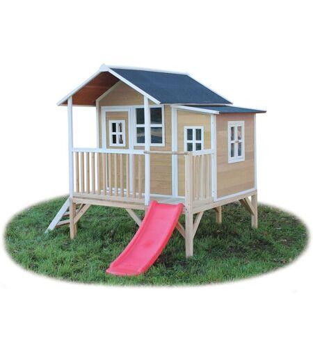 Chaque enfant r?ve d'avoir sa propre petite maison avec partie annexe dans le jardin, n'est-ce pas ? Un endroit pour bien s'amuser avec ses fr?res et s?urs ou avec ses petits copains et copines. Le mod?le Loft 350 est une telle maisonnette. Avec ses vastes dimensions int?rieures de 1,18 m x 1,71 m, ce mod?le permet de jouer ? plusieurs. Ce mod?le sur?lev? est ?quip? d'une v?ritable v?randa et d'un toboggan, pour redescendre en un instant ! Et, gr?ce au toit ?tanche, l'int?rieur reste toujours sec ! Avec ses ludiques fen?tres blanches, cette maisonnette est le r?ve de tout enfant ? partir de 3 ans.. Durable. Les petites maisons sont fabriqu?es en c?dre s?ch?. C'est une essence particuli?re, car elle r?siste de nature aux intemp?ries et ? l'humidit?. Elle n'est donc pas sensible ? la pourriture du bois. Le c?dre n'est pas trait? avec des produits chimiques malsains, comme c'est souvent le cas pour le pin et le sapin. Le c?dre respecte donc l'environnement et est s?r pour les enfants. Les panneaux sont d?j? peints avec une lasure ? base aqueuse.. S?curit?. Les petites maisons r?pondent aux normes de s?curit? actuellement en vigueur (EN-71) : les enfants peuvent donc s'amuser en toute s?curit?. Par ailleurs, cette essence n'est pas trait?e avec des produits chimiques malsains et elle pr?sente un autre avantage : elle ne forme pas d'?chardes.. Variation. La partie annexe peut ?tre mont?e aussi bien ? gauche qu'? droite.. Le toboggan peut ?tre mont? ? gauche, ? droite ou sur le devant.. Il en est de m?me pour l'escalier.. Montage simple. La petite maison se compose de panneaux, portes et fen?tres pr?assembl?s. C'est donc un v?ritable syst?me pr?fabriqu?.. Par ailleurs, les panneaux sont aussi munis d'avant-trous : la maison se monte donc en un tour de main.. Livraison en France m?tropolitaine Hors Corse Uniquement. D?lai de livraison moyen 15 jours ...