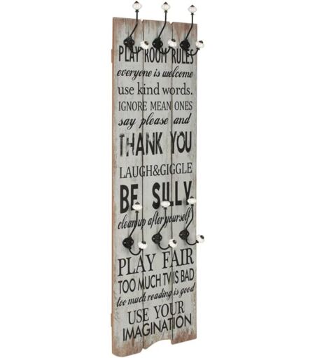Avec son imprimé de style vintage qui affiche « Play room rules Ignore mean ones Thank you Be silly Play fair Use your imagination », ce porte-manteau mural avec 6 crochets deviendra un véritable article attrayant que vos invités remarqueront immédiatement. Le porte-manteau est fabriqué en MDF, ce qui est très robuste. Conçu avec deux rangées de trois crochets en métal exquis, le porte-manteau offre amplement d'espace pour vos manteaux, sacs, foulards, chapeaux ou autres petits objets. Avec deux points d'attache à l'arrière, le porte-manteau peut être facilement monté sur le mur. L' assemblage est facile. La livraison comprend également le matériel de montage requis. Couleur : noir et blanc Matériau : panneau MDF + crochets métalliques Dimensions : 40 x 120 cm (l x H) Avec 1 panneau et 6 crochets Facile à assembler La livraison inclut les matériaux de montage ...