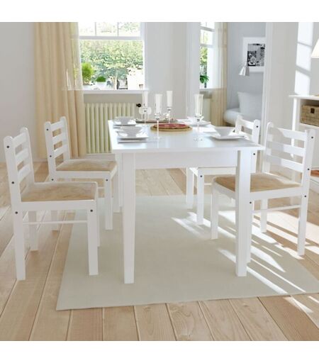 Cet ensemble, composé de quatre chaises de salle à manger en bois et de style classique, sera un excellent ajout à votre salle à manger ou cuisine. Les dossiers carrés leur donnent un charme rustique et ajoutent à votre confort d'assise avec le siège rembourré, recouvert de polyester lisse et doux au toucher. Leur construction solide en bois d'hévéa les rend stables et durables. La livraison comprend 4 chaises de salle à manger. Couleur : blanc Matériau : bois d'hévéa massif Dimensions totales : 44 x 45 x 81 cm (l x P x H) Largeur du siège : 40,5 cm Profondeur du siège : 40,5 cm Hauteur du siège à partir du sol : 45 cm La livraison comprend 4 chaises Matériel: Polyester: 100% ...