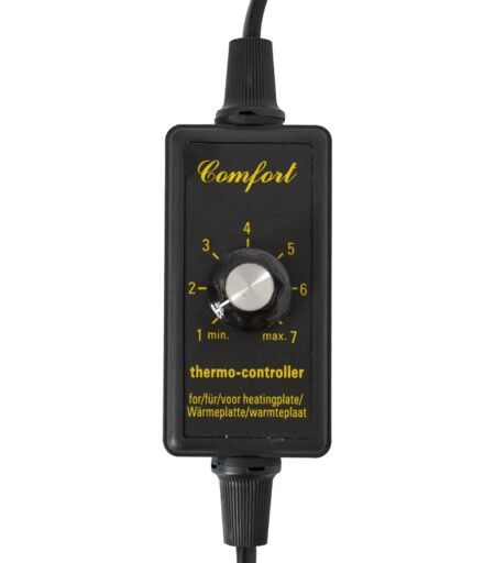 Régulateur pour panneau chauffant poussin Description : Thermostat permettant de réguler la température d'un panneau chauffant pour poussin. Plus le temps passe, moins les poussins nécessitent de chaleur, ce régulateur permet donc d'adapter la diffusion de chaleur du panneau chauffant à l'âge des poussins. La régulation permet de pousser les économies d'énergie réalisées avec le panneau chauffant à leur maximum. Fonctionnement : En tournant le bouton de réglage (1-7), la température du panneau chauffant peut être contrôlée. Position 1 - température basse (fournit environ 20% de la puissance du panneau chauffant). Position 7 - puissance maximum (correspond à l’utilisation sans le régulateur). Le régulateur ajuste la température du panneau chauffant basé sur la pulsation. En position 1, il laisse passer peu de puissance et pulse lentement. En position 6, le WPR pulse très vite et laisse passer aussi beaucoup de puissance. En position 7, le régulateur laisse passer toute la puissance sans pulser. La pulsation est détectable sur la base de la LED clignotante du panneau chauffant. Connexion : Connectez le câble du panneau chauffant à la prise du régulateur (douille). Assurez-vous que la connexion est bien ferme. Ensuite, connectez la fiche de courant du régulateur à une prise de courant. Positionnez le régulateur en position 7. Utilisation : Sélectionnez maintenant la position correcte en accord avec le besoin de chaleur de vos poussins. Commencez avec la position la plus chaude (position 7) et continuez à ajuster en étapes. Après chaque ajustement, il faut attendre environ 30 minutes avant de pouvoir évaluer les résultats. Les poussins indiquent eux-mêmes si la chaleur est suffisante ou pas. Si le panneau chauffant est trop chaud, les poussins vont s'éloigner de lui. Si le panneau chauffant est trop froid, les poussins vont s’asseoir l’un contre l’autre pour se tenir au chaud. L’observation du comportement des poussins est pourtant d'importance cruciale pour un ajustement correct du régulateur. Important : Ce produit doit être utilisé seulement en combinaison avec les modèles de panneaux chauffants de marque Olba. ...