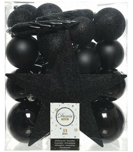 Boite De 33 Accessoires Pour Arbre Couleur Noir: 1 Etoile Avec Paillettes, 4x8cm Boule Noir Brillant, 6x6cm Boule Noir Brillante, 6x6cm Boule Noire, 6x6cm Boule Paillettes, 4x5cm Boule Noir Brillant, 3x2,5cm Boule À Paillettes, 3 Stalactites Noir Brillant. ...