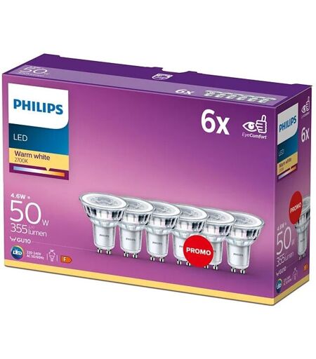 Philips - ampoule led Spot GU10 50W Blanc Chaud, Verre, Lot de 6