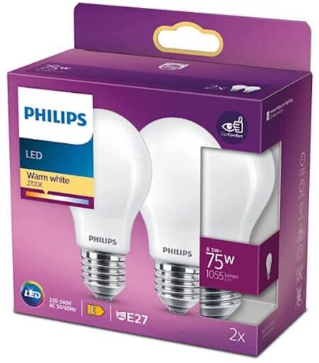 Ampoule led Standard E27 75W Blanc Chaud Dépolie, Verre, Lot de 2 - Philips